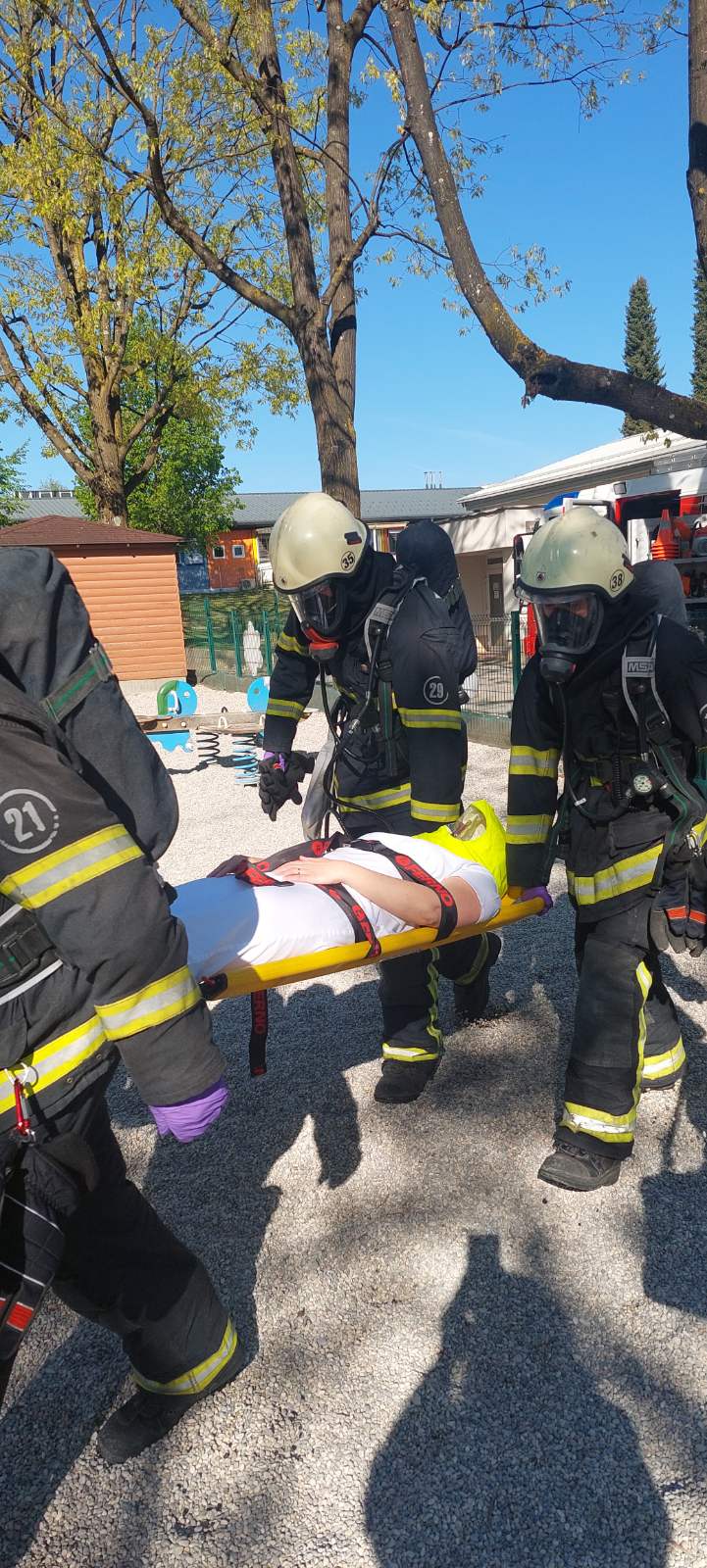 Napetost je dosegla vrhunec, ko so na prizorišče pridrveli gasilci PGD Grosuplje. Iz “zadimljenega” objekta so na nosilih varno prinesli našo kuharico, ki ji je bolničarka takoj nudila prvo pomoč. Otroci so z občudovanjem opazovali uigranost ekipe in spoznali, da v kritičnih trenutkih štejeta predvsem zbranost in medsebojna pomoč.